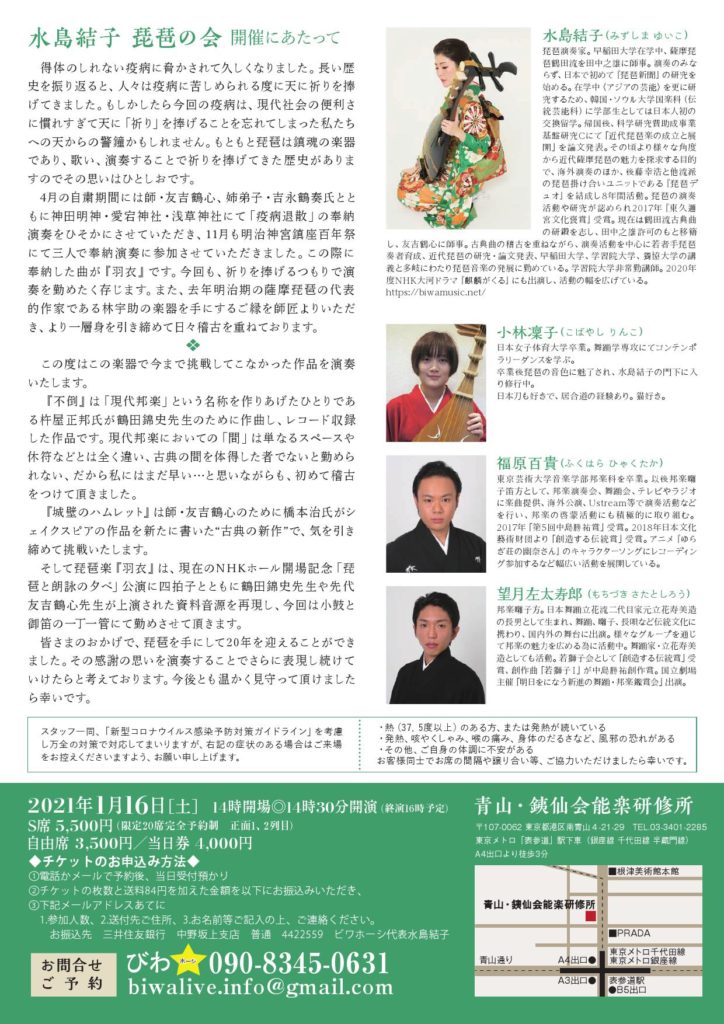 1月16日(土)水島結子琵琶の会 @青山・銕仙会能楽研究所