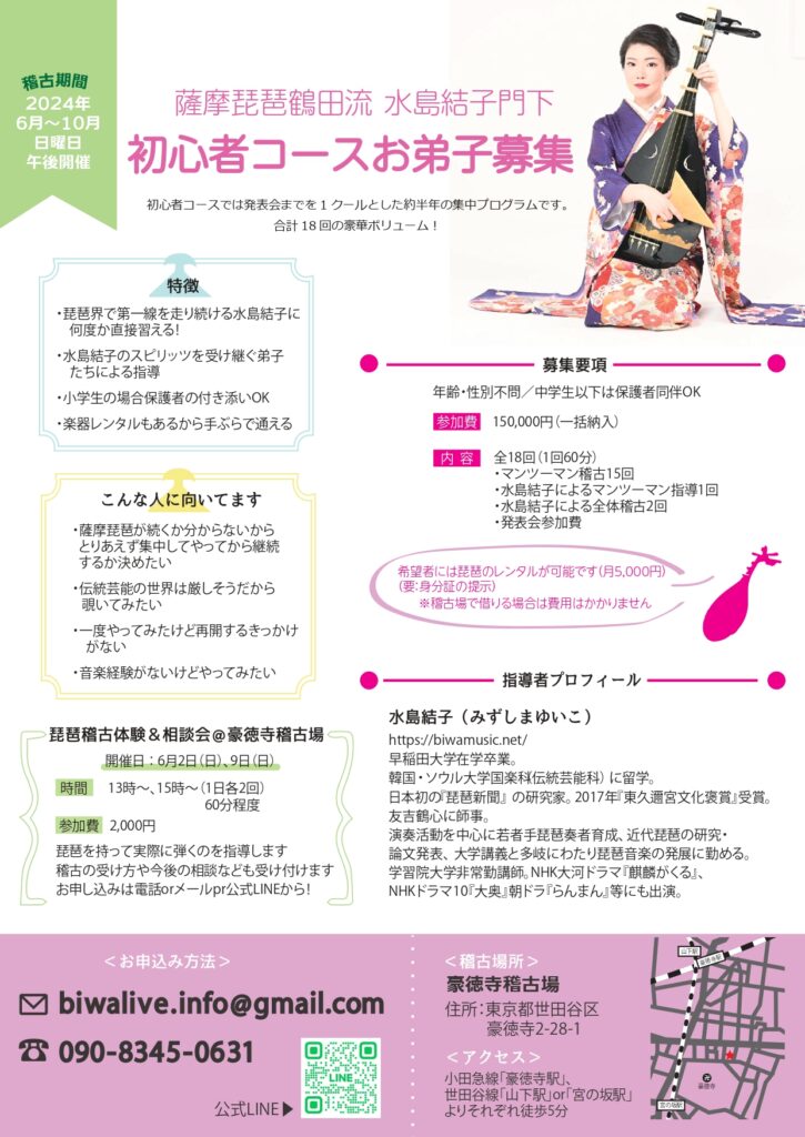 そこでお伝えさせていただいた新規お弟子募集&琵琶体験会を