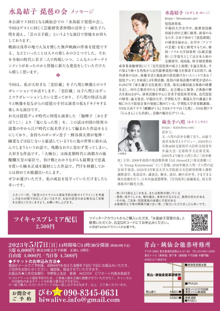 出演:水島結子(琵琶)、ゲスト:麻生子八咫(活弁)