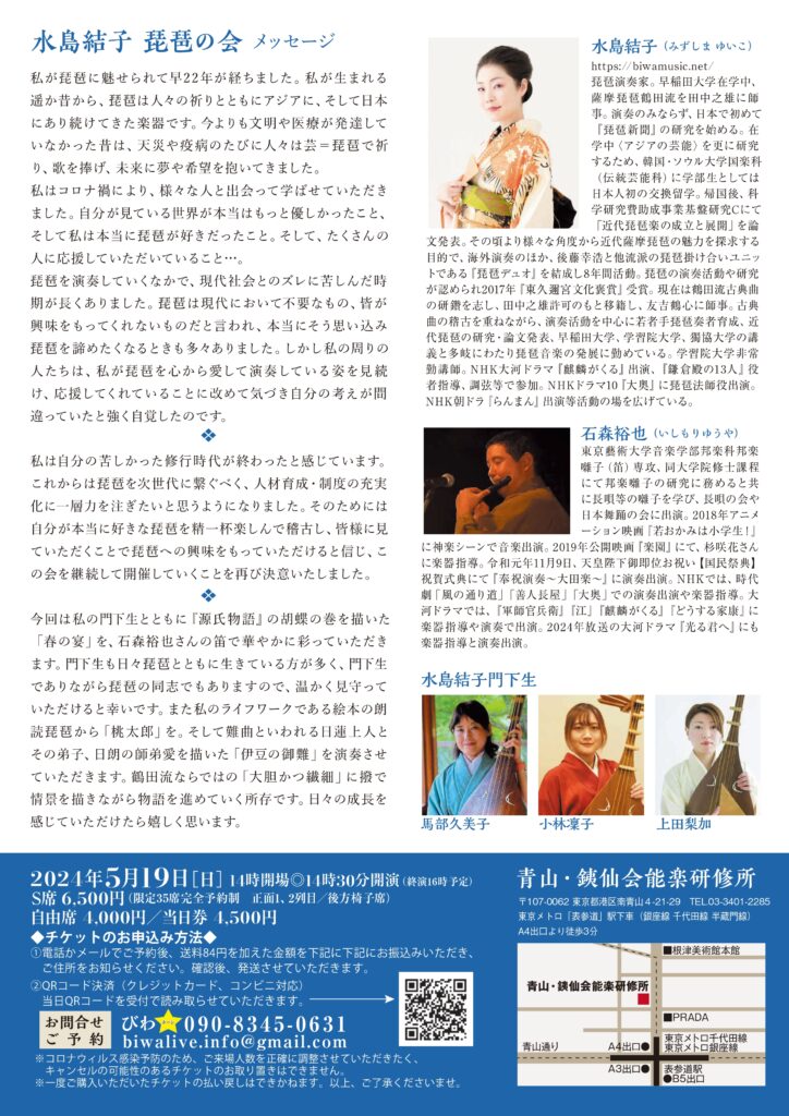 出演:水島結子(琵琶)、石森裕也(笛)、馬部久美子、小林凜子、上田梨加(琵琶・水島結子門下生)